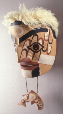 Materials     Wood, Paint, Cedar Bark, Animal Hair, Abalone, Leather