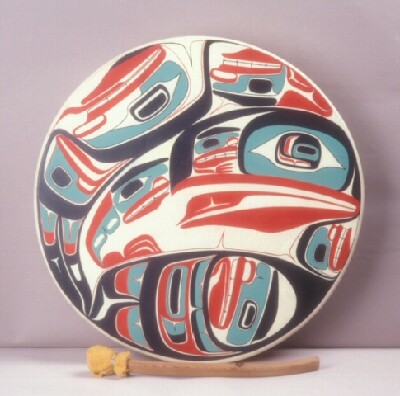 "Spirit of the Ancestors"-Small round skin drums were used during the 19th century primarily on the southern coast by Coast Salish religious dancers. On the northern coast they were used primarily by shamans in their curing work. Perhaps through their use to accompany the singing at gambling games (lehal), the use of round skin drums has spread during the 20th century to become the most frequently used drum at potlatches and other social occasions.