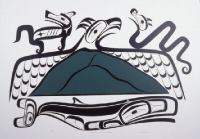"This print was designed and sold to raise money for the effort to prevent the logging of Meares Island. The Thunderbird, Wolf, Lightning Serpent, and Whale surround the image of the island."