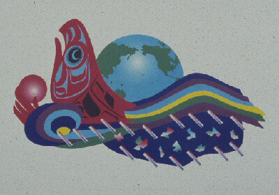 "The Sky Salmon, holding her egg, rises out of the rainbow amidst other elements of weather; the world environment is indicated by the image of the Earth focused on the Pacific region. Designed as a gift to donors, the print celebrates the 1997 opening of the Burke Museum's new exhibits 'Pacific Voices' and 'Life and Times of Washington State'."